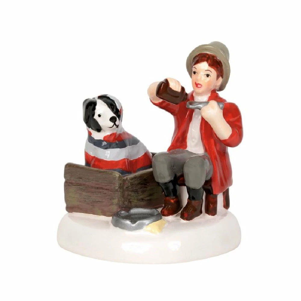 Based on the classic Norman Rockwell painting, a young boy prepares to take a spoonful of medicine as his companionable canine watches from a crate.