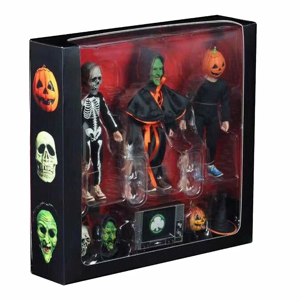 Each figure comes with two heads. One showing the iconic Silver Shamrock mask and the other after they had the misfortune of watching Mr. Conal Cochrane’s trick of a commercial! Figures stand approximately 6″ in height and come with trick or treat bags and a TV set accessory.